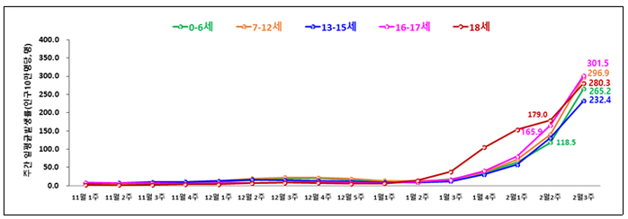 학령기 연령군의 경우, 전주보다 모든 연령군에서 일평균 발생률이 1.6배이상 늘었다. 특히 0~6세 연령군의 발생률은 118.5명에서 265.2명으로 2.2배 이상 급증했다.