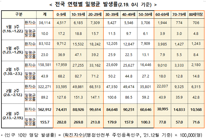 ▲ 전국 연령별 일평균 발생률. [중앙방역대책본부 제공] |
