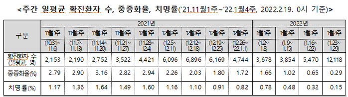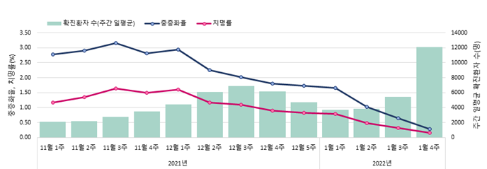 그러나 1월 4주 중증화율은 0.29%, 치명률은 0.15%로 델타변이가 유행하던 지난해 11~12월에 비해 낮아진 상황이다.