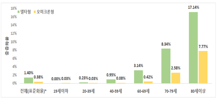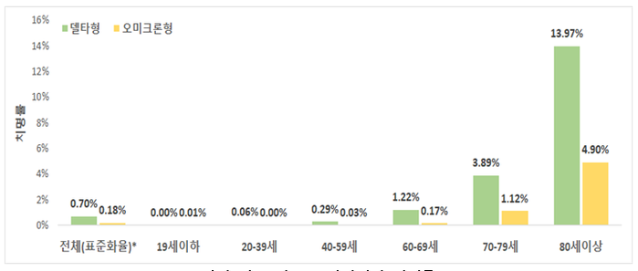 ▲ 델타 및 오미크론 연령대별 치명률. [중앙방역대책본부 제공] |
