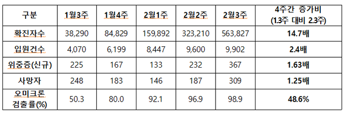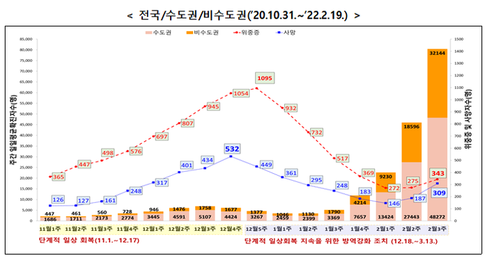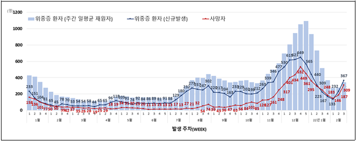 국내 전체 확진자수의 급증에 따라 2월 3주 신규 위중증 환자는 전주 대비 1.6배 증가한 367명, 위중증 환자 증가에 따라 사망자도 직전주보다 1.7배 증가한 309명이었다. 확진자 증가에 따라 위중증과 사망 증가세는 지속될 것으로 판단하고 있다.