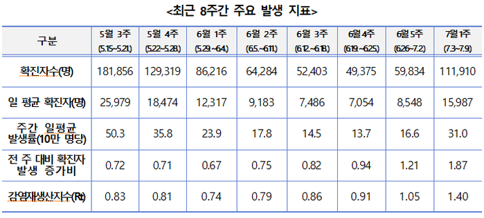 6월 4주 4만9천명에서 6월 5주에 5만9천명으로 늘어난데 이어 7월 1주(3~9일)에는 주간 확진자가 11만1910명으로 전주에 비해 두 배 가까이 증가하는 ‘더블링’을 보였다.