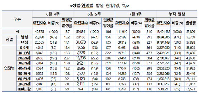 | ▲ 성별 및 연령별 발생 현황. [중앙방역대책본부 제공] |