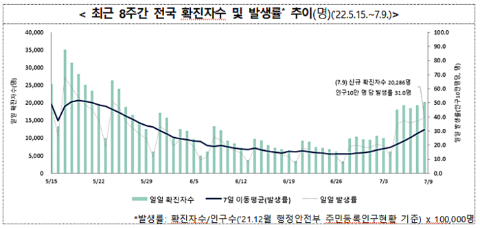방대본에 따르면, 코로나19 주간 신규 확진자 수는 6월 4주 이후 3주 연속 증가했다.