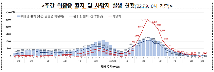 중증 위험이 높은 60세 이상 확진자의 규모는 1만4220명으로 전주(8205명)보다 증가했으나 비중은 전주 13.7%에서 12.7%로 감소했다.7월 1주 주간 신규 위중증 환자 수는 48명으로 전주(50명) 대비 4.0% 줄었고, 사망자는 62명으로 전주(46명)보다 34.8% 늘었다.