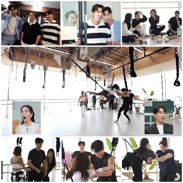 그러나 잠시 후, 이들의 반응은 180도로 바뀐다. 번지 피트니스 센터장이 “저희 센터에 솔로 여자 분들이 많다”고 귀띔하기 때문. 이에 눈빛이 달라진 신성은 “운동하다가 찌릿할 수 있으니까~”라며 이글이글 불타오른다. 실제로 미모의 선생님들이 등장하자, 김용준은 “저희 집은 여기서 엎어지면 코 닿을 곳”이라며 적극 어필한다. 이윽고 3인방은 본격적인 번지 피트니스 수업을 위해 선생님들의 도움을 받아 하네스(줄과 몸을 이어주는 장치)를 착용한다. 왠지 모를 민망함을 무릎 쓰고 하네스를 입은 3인방은 “아기가 된 기분”, “강아지들이 이거 입기 싫어하는 이유를 알겠다”며 너스레를 떨어 폭소를 자아낸다.
