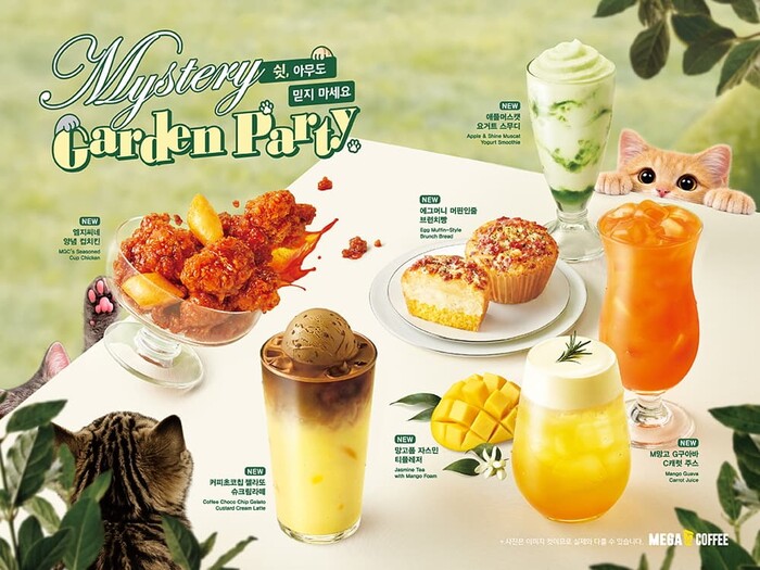 메가MGC커피는 12일 ‘미스터리 가든 파티(Mystery Garden Party)’ 콘셉트를 적용한 봄 시즌 신메뉴를 선보였다고 밝혔다. 이번 시즌은 가든 파티에서 벌어진 미스터리를 테마로 ‘쉿, 아무도 믿지 마세요’, ‘누가 치킨을 먹었을까?’ 등 스토리형 카피를 활용했다.