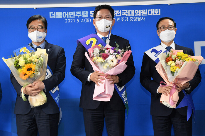 ▲ 더불어민주당 새 대표로 선출된 송영길 의원(가운데)이 2일 서울 여의도 중앙당사에서 열린 임시전국대의원대회에서 경쟁했던 우원식(왼쪽), 홍영표 의원과 기념촬영을 하고 있다. [사진= 연합뉴스] |