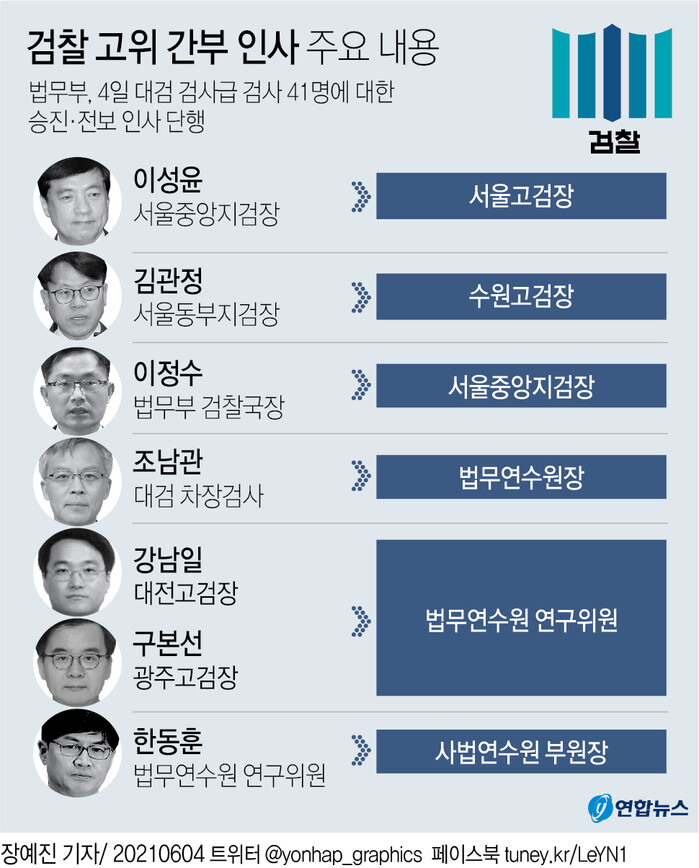특히 이성윤 지검장, 김관정(26기) 동부지검장 등 친정부 성향으로 분류된 간부들이 주요 요직에 배치됐다.