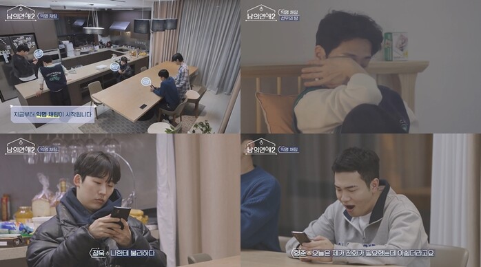 ▲ '남의 연애2' 남자들이 전화 대신 채팅으로 서로를 향한 호감을 확인한다. [사진=웨이브] |