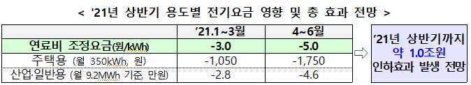 | ▲ 2021년 상반기 용도별 전기요금 영향 및 총 효과 전망. [출처= 산업통상자원부] |