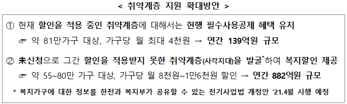 취약계층에 대한 전기요금 지원은 보다 확대하되, 일반가구에 대한 할인적용은 점진적으로 축소해 2022년 7월에는 폐지한다.