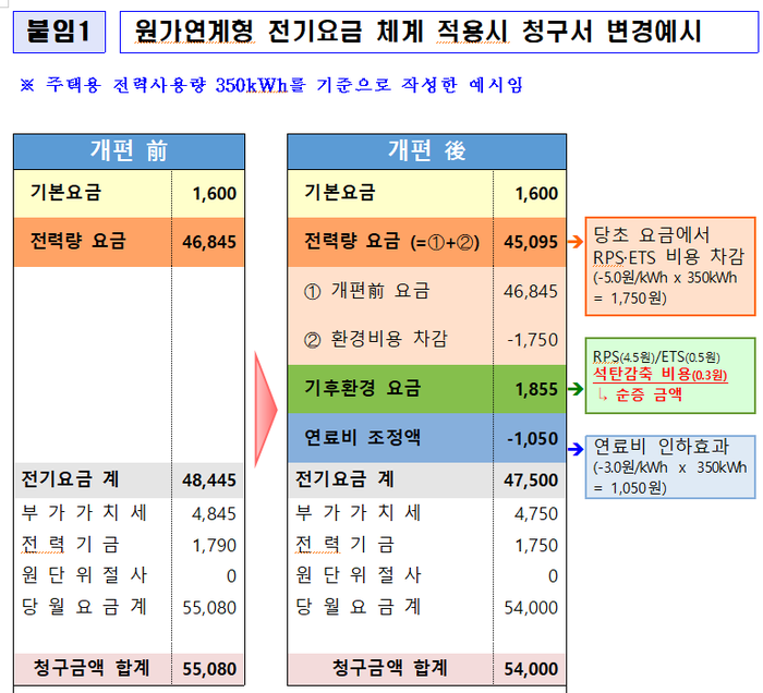| ▲ 원가연계형 전기요금 체계 적용시 청구서 변경예시. 내년 1월에는 kWh당 -3.0원의 연료비 조정이 이뤄지므로 전력사용량 350kWh에 대한 전체 요금 인하분은 1050원이 된다. 따라서 기본요금 1600원, 전력량 요금 4만5095원, 기후·환경 요금 1855원, 연료비 조정액 -1050원을 합한 전기요금 4만7500원에 부가가치세 4750원, 전력기금 1750원을 더하면 총 청구금액은 5만4천원이 된다. 전기요금 개편 전과 비교하면 최종 청구액이 1080원 적어진 액수다. [출처= 산업통상자원부] |