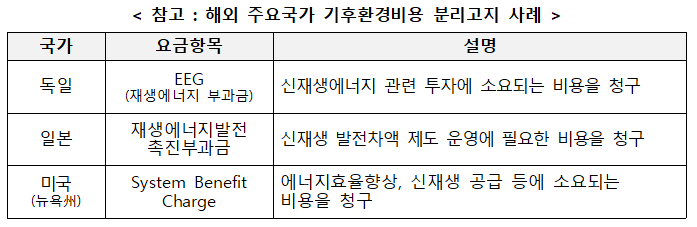 | ▲ 해외 주요국가 기후환경비용 분리고지 사례. [출처= 산업통상자원부] |