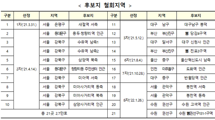 철회 지역은 서울 은평구 새절역 서측, 동대문구 용두·청량리역 인근, 강북구 수유역 남측·삼양역 북측, 강북구 미아사거리역 동측‧북측, 부산 전포3구역, 대구 달서구 신청사 인근, 인천 미추홀구 도화역 인근 등이다.