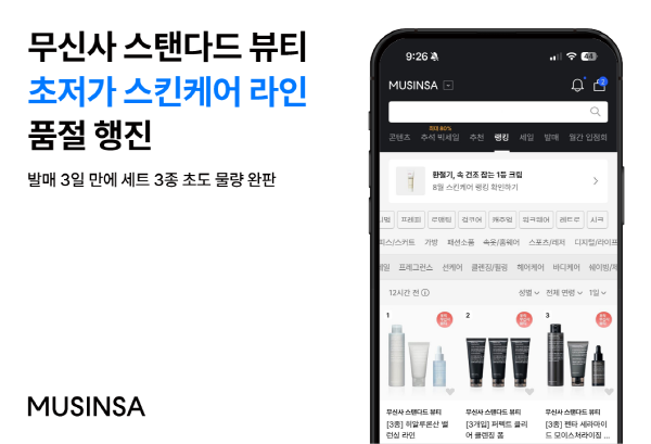 [메가경제=심영범 기자]무신사가 전개하는 ‘무신사 스탠다드 뷰티(MUSINSA STANDARD BEAUTY)’의 첫 초저가 스킨케어 라인이 출시와 동시에 주목받으며 품절 행진을 이어가고 있다고 3일 밝혔다.