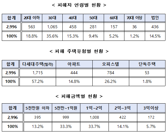주택유형별은 ‘다세대주택(빌라)‧오피스텔’이 83.4%로 피해의 대부분을 차지했다. 이어 오피스텔 26.2%(784명), 아파트 14.8%(444명), 단독주택 1.8%(53명) 순이었다.