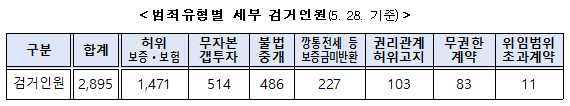 범죄유형별로는 금융기관 전세자금대출 등 공적 기금을 소진하는 ‘허위 보증‧보험’ 1471명, 조직적으로 보증금이나 소개료를 편취한 ‘무자본 갭투자’ 514명, 법정 초과 수수‧중요사항 미고지 등 ‘불법 중개행위’ 486명 순으로 검거됐다.