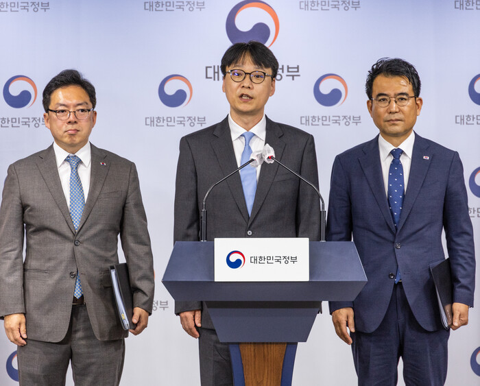 | ▲ 황병주 대검찰청 형사부장(가운데), 윤승영 경찰청 국가수사본부 수사국장(왼쪽), 남영우 국토교통부 토지정책관이 8일 오전 서울 종로구 정부서울청사에서 전세 사기 기획 조사 결과 및 특별단속 중간 결과를 발표하고 있다. [서울=연합뉴스] |